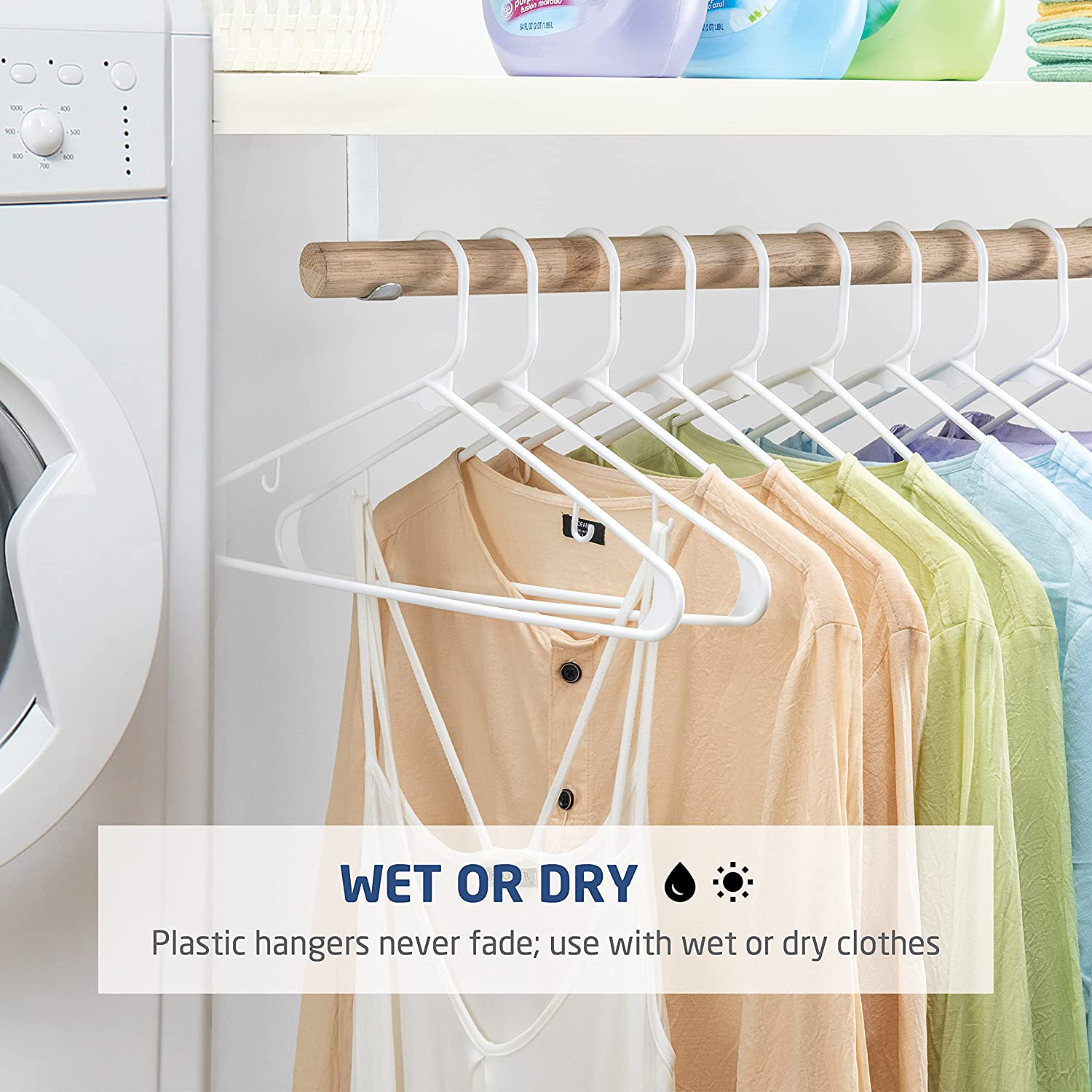 Optimize your closet space with these everyday plastic hangers. Perfect for organizing and air-drying various types of garments, their slim profile and space-saving design make them a must-have for a clutter-free closet. With reinforced edges for added durability, these hangers are designed to last.